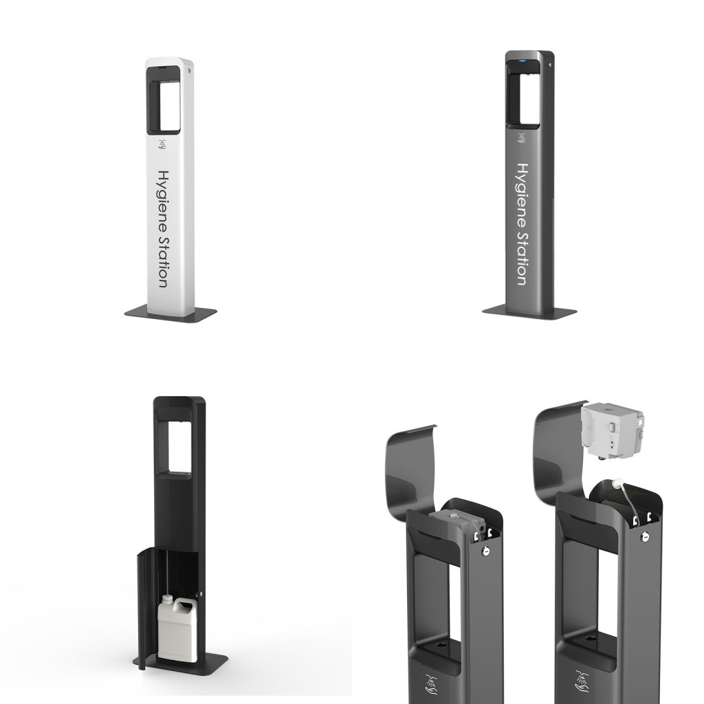 Sanitiser stations and hygiene units can be treated with powder coating to guarantee durability and long service. Powder coating allows easy cleaning and protects against frequent treatment with disinfectants. In addition to powder coating, we offer finishing techniques such as pad printing, engraving and tampo printing, so your sanitiser stations can be equipped with any necessary graphics or branding and delivered directly to the end-user.